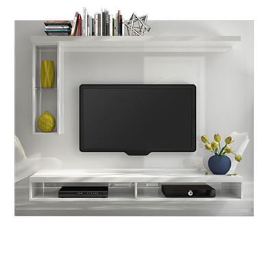 Possui 1 prateleira na parte superior, 1 prateleira com divisória na parta inferior e 1 nicho com divisórias na lateral do painel. Ideal para ser utilizado com TV\'s de tela plana ou LCD.